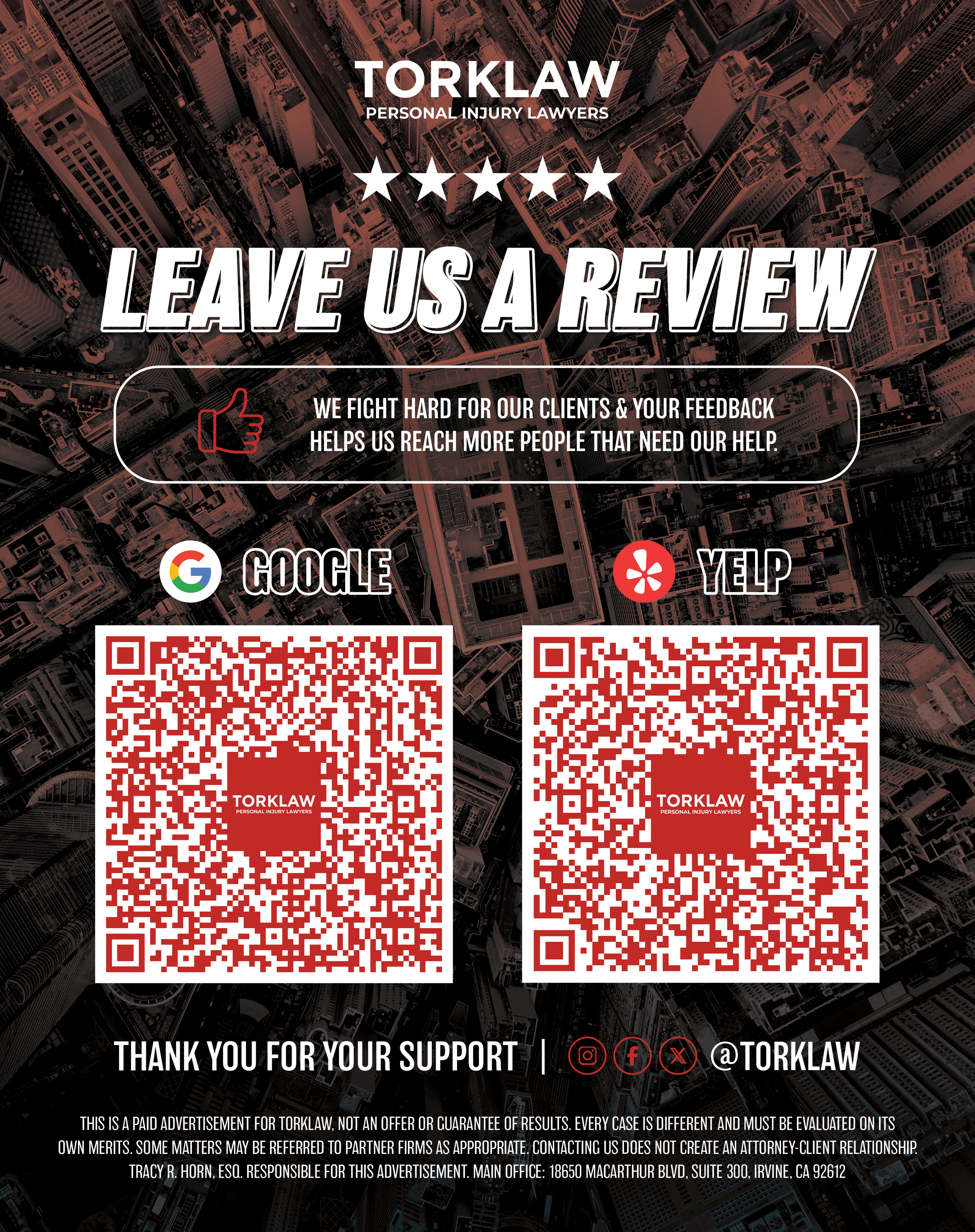 TORKLAW’s printed materials consist of A-frames, event signage, ads, postcards, and flyers.